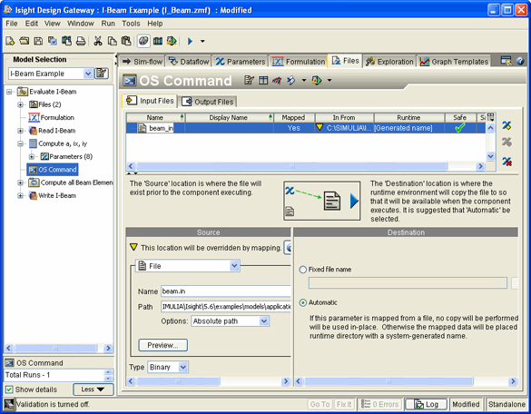 Isight copies the file parameter into the working directory with the same name as the original file. When the command is run, the full path to this file is passed to the operating system (and the file is made an executable on Linux). If the executable that you entered is large, you can change the Source area from In Model to File to reduce the size of the model file. Doing so, however, requires that all SIMULIA Execution Engine stations that are to run this program have access to the specified file system. Alternatively, the affinities for the OS Command component can be set so this component runs only on the one computer where this program has been installed. If the Source location is an absolute path, you can change the Destination location from Fixed file name to Automatic to avoid copying the file; instead, the absolute path of the Source file will be passed to the operating system as the name of the program to run. This is the equivalent to not distributing the program. | |||||||