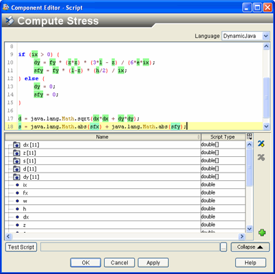 For more information on creating, using, and mapping parameters, see Defining and Mapping Parameters and File Parameters in the Isight User’s Guide. Your scripts are executed when you run the model that contains the Script component. When the script is running, it cannot create new parameters or change the type of a parameter. Model customization scripts can be used to modify a model before it is executed. For more information on model customization, see Customizing Models in the Isight User’s Guide. The following figure shows an example of the Script Component Editor: