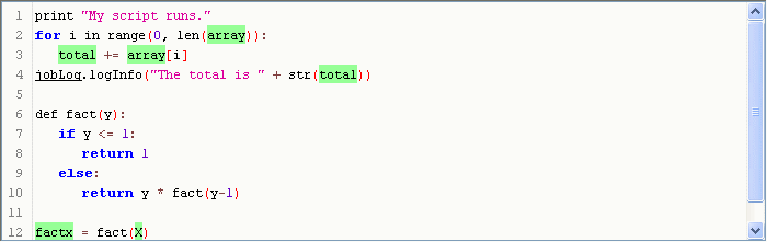 A Jython script consists of Python statements. Most statements are assignments (x = y*3-5) or method calls (jobLog.logInfo("foo bar")). Statements end at the end of a line, with no need for punctuation like a semicolon. An example of a Jython script, as it appears in the Script Component Editor, is shown below:
