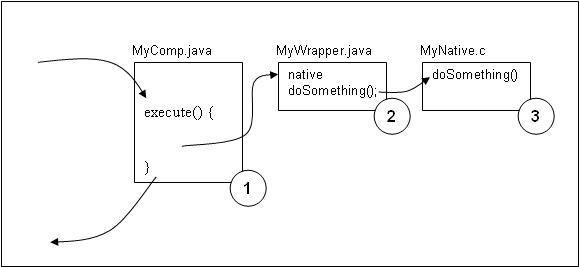 Component StructureProper structuring of a component and separation of the JNI part from the rest of the component can help to minimize many of the issues related to Java JNI technology. This section describes how to structure a component so that native code limitations are minimized. Separate the component into three distinct parts.