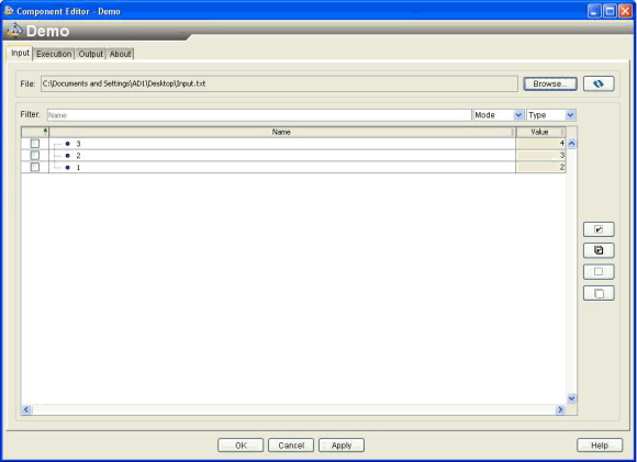 ResMgr. This class contains several utility methods to provide a consistent way of handling i18n internationalization (i18n) by encapsulating the Class.getResource() method. The Command with File I/O template uses the getMessage method to internationalize strings that are displayed. The following is the typical usage of this method: ResMgr.getMessage(CLASS, 0, "Some message!"); You should replace 0 with a unique number for each message and you should put all the numbers and corresponding messages in a messages.properties file as key value pairs (e.g., 23=Some message). If you want to localize your component to, for example, the French language then create a messages_fr.properties file and put the translated messages in the file with the corresponding keys (e.g., 23=<French "Some message">. Depending on the locale of the user, Isight automatically picks up the appropriate messages. If there is no particular localization, the third argument of the getMessage() method is used as the default message. The two-letter language codes for each language used for the message file names (messages_<two letter code>.properties) are defined by the ISO-639 standard (refer to the java.util.Locale class). IString. This class represents an i18n string. It is used similarly to the ResMgr.getMessage() method. However, it is more powerful because the IString object can be persisted to the database in a locale-neutral, component-aware form. You should use IString in messages that will be written to the log (both at design time and at run time). For more details about these APIs, refer to the Isight javadocs.The following figure shows the Command with File I/O interface: