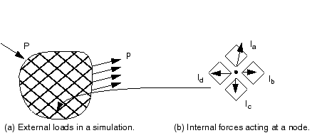 The objective of the analysis is to determine this response. Consider the external forces, P, and the internal (nodal) forces, I, acting on a body (see Figure 8–8(a) and Figure 8–8(b), respectively). The internal loads acting on a node are caused by the stresses in the elements that contain that node.For the body to be in static equilibrium, the net force acting at every node must be zero. Therefore, the basic statement of static equilibrium is that the internal forces, I, and the external forces, P, must balance each other: